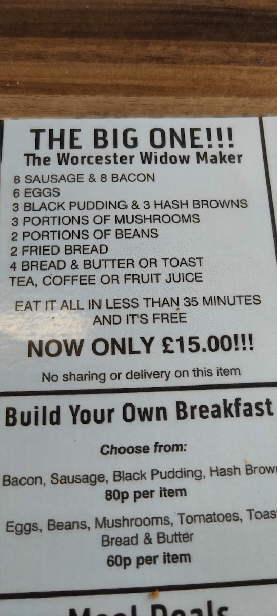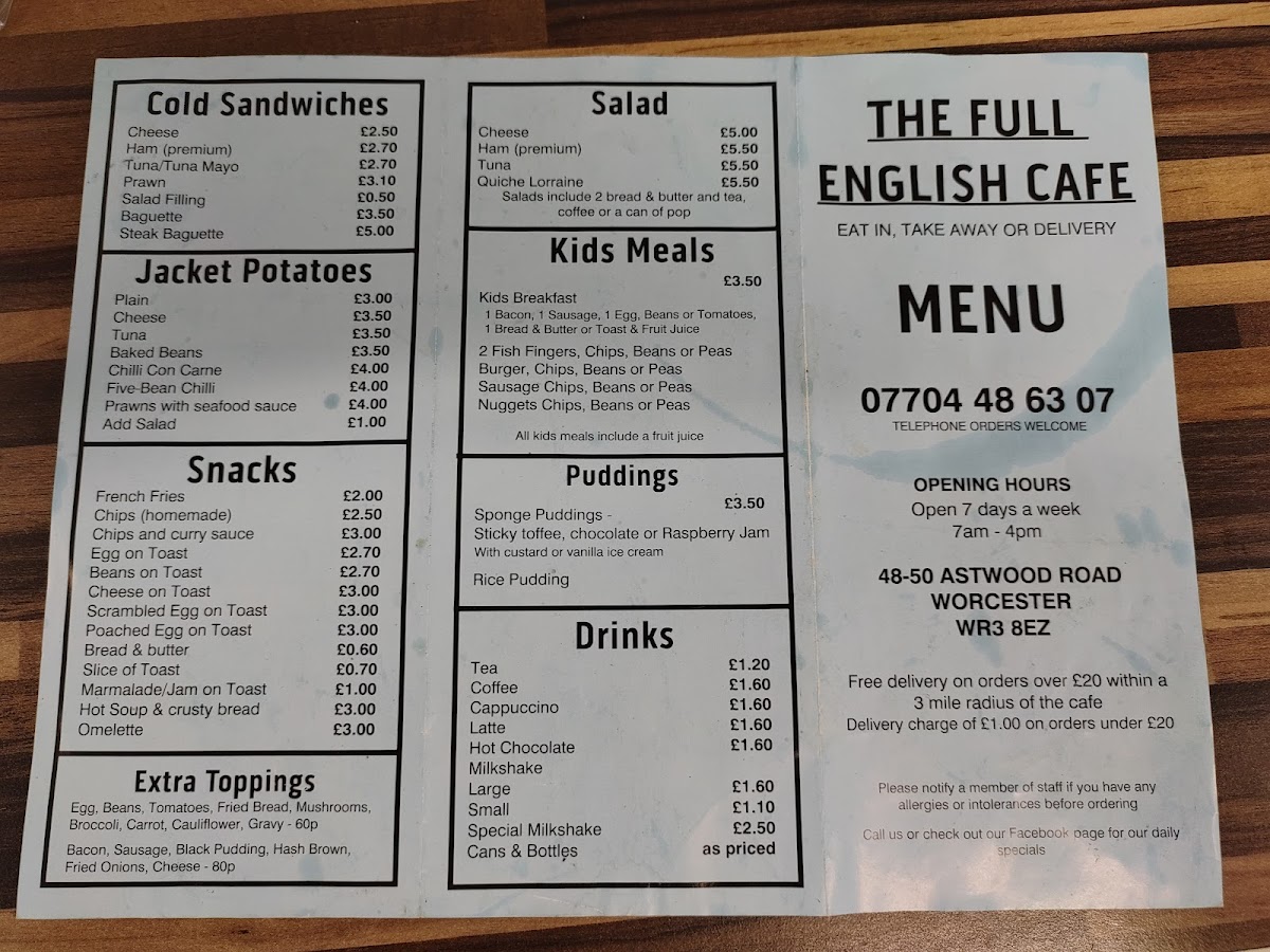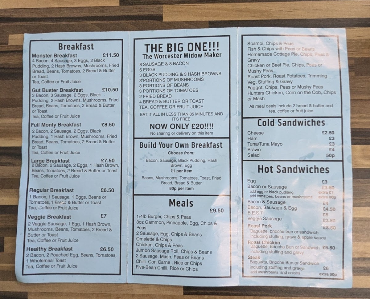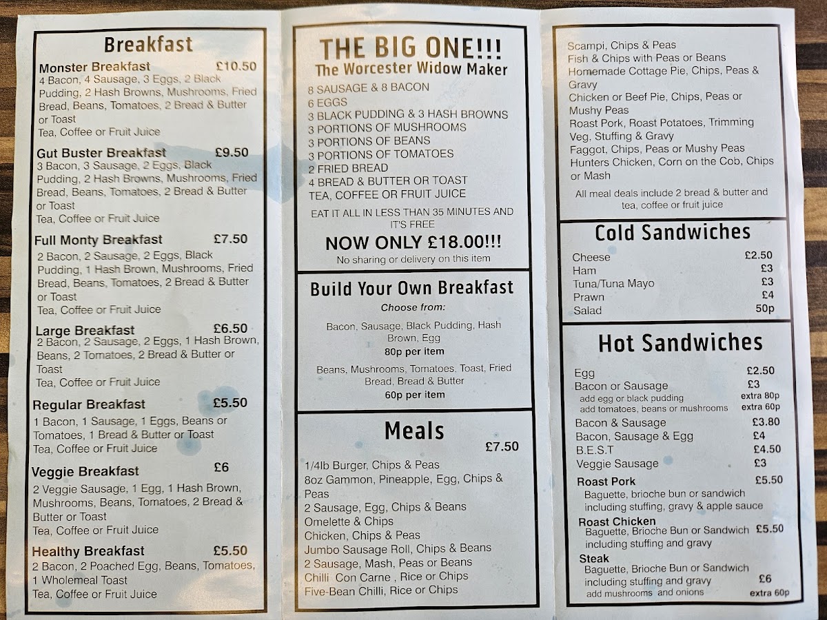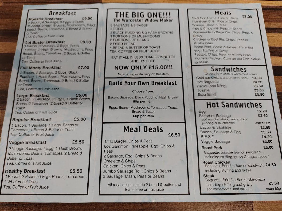 Overall, the menu at The Full English Cafe in Worcester delivers exactly what you’d hope for from a classic British breakfast spot-simple, hearty, and satisfying. The standout plates, particularly the Sausage Egg Chips & Beans and Sausage Egg and Chips, showcase the café’s commitment to generous portions and traditional flavors, with well-cooked sausages, perfectly fried eggs, and crisp, golden chips forming the backbone of these comforting meals. The inclusion of beans adds that familiar, homely touch that ties everything together. While the menu doesn’t aim to be adventurous, it excels in consistency and value, making it a reliable choice for anyone craving a no-nonsense, filling breakfast or brunch that hits all the right notes.